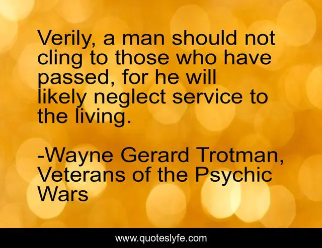 This page presents the quote "Verily, a man should not cling to those who have passed, for he will likely neglect service to the living.". Author of this quote is Wayne Gerard Trotman, Veterans of the Psychic Wars. This quote is about loss, death, service, possessiveness, loss-of-love, grief, chi-ro-jin, grieving,.