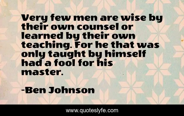 This page presents the quote "Very few men are wise by their own counsel or learned by their own teaching. For he that was only taught by himself had a fool for his master.". Author of this quote is Ben Johnson. This quote is about models, role,.