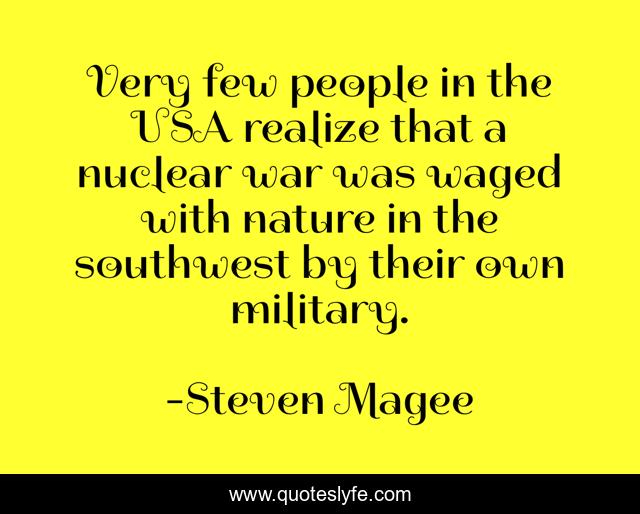This page presents the quote "Very few people in the USA realize that a nuclear war was waged with nature in the southwest by their own military.". Author of this quote is Steven Magee. This quote is about few, own, usa, people, very, nuclear, nature, waged, military-history,.