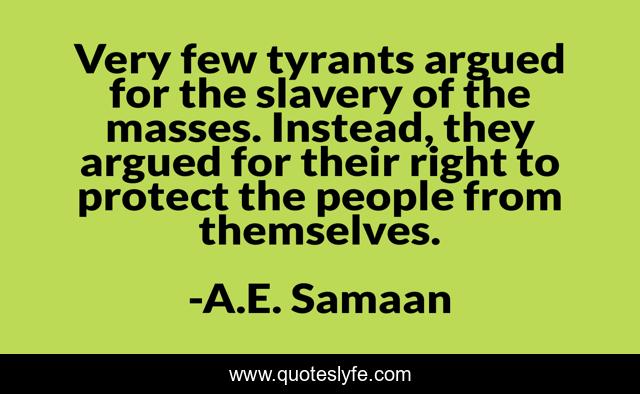 This page presents the quote "Very few tyrants argued for the slavery of the masses. Instead, they argued for their right to protect the people from themselves.". Author of this quote is A.E. Samaan. This quote is about communism, tyrants, libertarianism, totalitarian, slavery, liberty, government-regulation, government-abuse, slavery-history,.