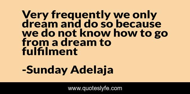 This page presents the quote "Very frequently we only dream and do so because we do not know how to go from a dream to fulfilment". Author of this quote is Sunday Adelaja. This quote is about life, knowledge, frequent-thoughts, fulfilment, ignorance, calling, purpose, truth, dream,.