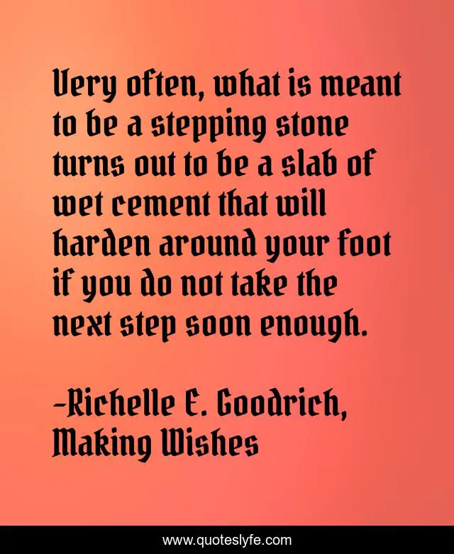 This page presents the quote "Very often, what is meant to be a stepping stone turns out to be a slab of wet cement that will harden around your foot if you do not take the next step soon enough.". Author of this quote is Richelle E. Goodrich, Making Wishes. This quote is about design, richelle-e-goodrich, ambition, destination, stepping-stone, step, richelle, goals, richelle-goodrich,.