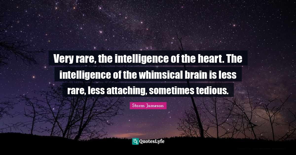 This page presents the quote "Very rare, the intelligence of the heart. The intelligence of the whimsical brain is less rare, less attaching, sometimes tedious.". Author of this quote is Storm Jameson. This quote is about tedious, brain, whimsical, intelligence, sometimes, heart,.