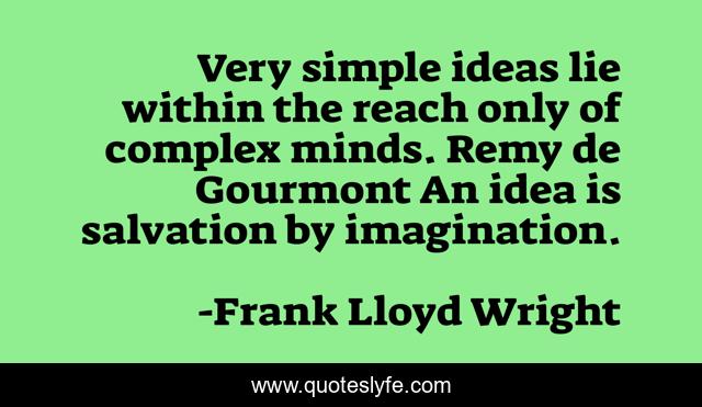 This page presents the quote "Very simple ideas lie within the reach only of complex minds. Remy de Gourmont An idea is salvation by imagination.". Author of this quote is Frank Lloyd Wright. .