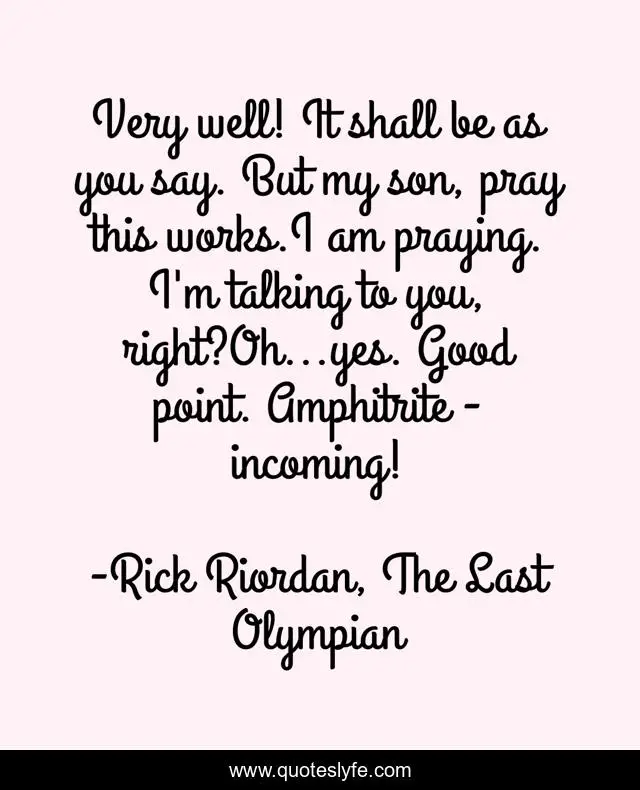 This page presents the quote "Very well! It shall be as you say. But my son, pray this works.I am praying. I'm talking to you, right?Oh...yes. Good point. Amphitrite - incoming!". Author of this quote is Rick Riordan, The Last Olympian. This quote is about percy, gods, poseidon, pray,.