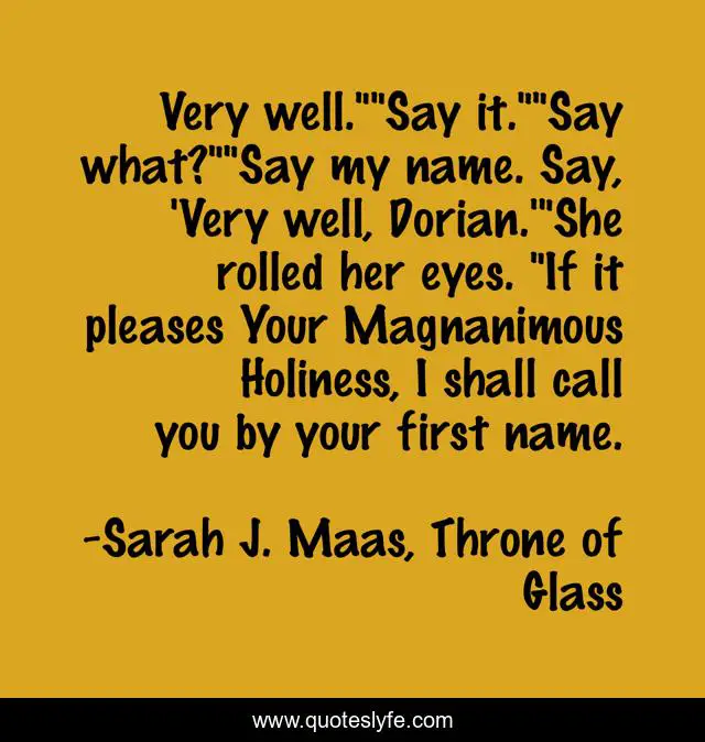 This page presents the quote "Very well.""Say it.""Say what?""Say my name. Say, 'Very well, Dorian.'"She rolled her eyes. "If it pleases Your Magnanimous Holiness, I shall call you by your first name.". Author of this quote is Sarah J. Maas, Throne of Glass. This quote is about celaena, dorian, friends,.