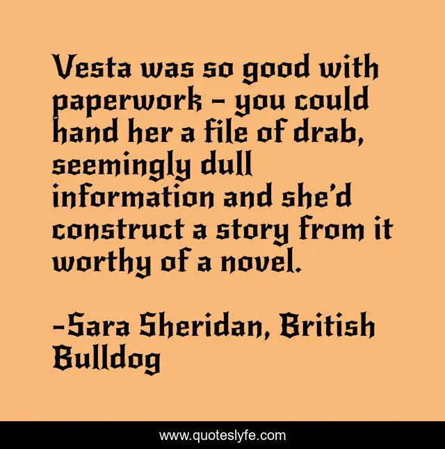 This page presents the quote "Vesta was so good with paperwork – you could hand her a file of drab, seemingly dull information and she’d construct a story from it worthy of a novel.". Author of this quote is Sara Sheridan, British Bulldog. This quote is about paperwork, mirabelle-bevan, storytelling, sara-sheridan, imagination, vesta, filing,.