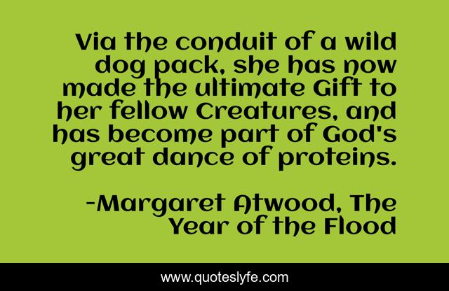 This page presents the quote "Via the conduit of a wild dog pack, she has now made the ultimate Gift to her fellow Creatures, and has become part of God's great dance of proteins.". Author of this quote is Margaret Atwood, The Year of the Flood. .