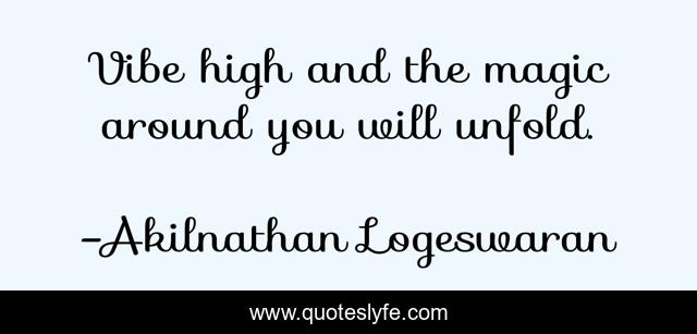 This page presents the quote "Vibe high and the magic around you will unfold.". Author of this quote is Akilnathan Logeswaran. This quote is about magic, good-vibes, vibrations, vibration, potential, self-empowerment, inspirational, enthusiasm,.