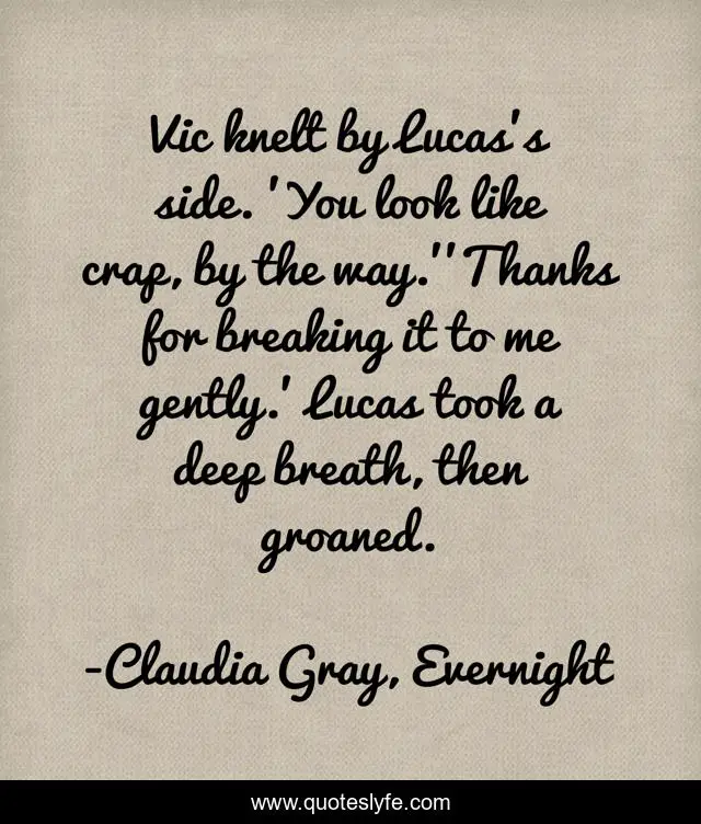 This page presents the quote "Vic knelt by Lucas's side. 'You look like crap, by the way.''Thanks for breaking it to me gently.' Lucas took a deep breath, then groaned.". Author of this quote is Claudia Gray, Evernight. This quote is about funny, comedy,.