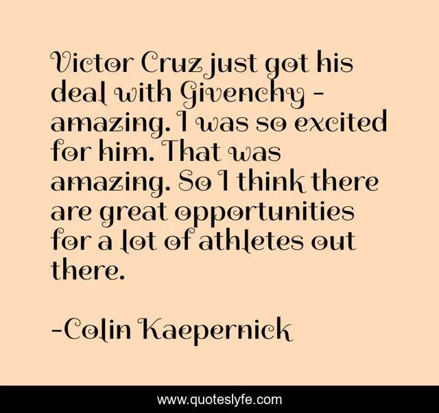 This page presents the quote "Victor Cruz just got his deal with Givenchy - amazing. I was so excited for him. That was amazing. So I think there are great opportunities for a lot of athletes out there.". Author of this quote is Colin Kaepernick. This quote is about great, think, opportunities,.