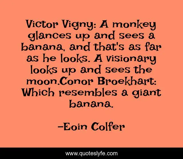This page presents the quote "Victor Vigny: A monkey glances up and sees a banana, and that's as far as he looks. A visionary looks up and sees the moon.Conor Broekhart: Which resembles a giant banana.". Author of this quote is Eoin Colfer. This quote is about airman, humour, visionary, moon, inspirational, enthusiasm, monkey,.