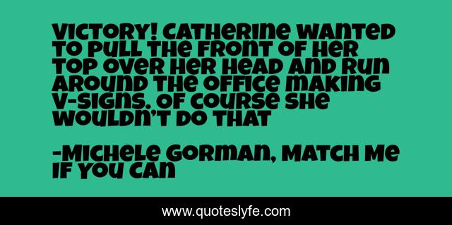 This page presents the quote "Victory! Catherine wanted to pull the front of her top over her head and run around the office making V-signs. Of course she wouldn’t do that". Author of this quote is Michele Gorman, Match Me If You Can. This quote is about humorous, chick-lit, romance, laughing,.