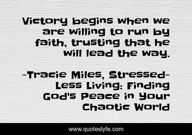This page presents the quote "Victory begins when we are willing to run by faith, trusting that he will lead the way.". Author of this quote is Tracie Miles, Stressed-Less Living: Finding God's Peace in Your Chaotic World. This quote is about faith, trust, christianity, god,.