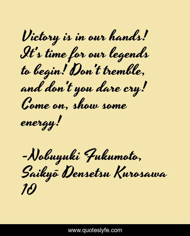 This page presents the quote "Victory is in our hands! It's time for our legends to begin! Don't tremble, and don't you dare cry! Come on, show some energy!". Author of this quote is Nobuyuki Fukumoto, Saikyō Densetsu Kurosawa 10. This quote is about cry, energy, men, victory, tremble, legend,.
