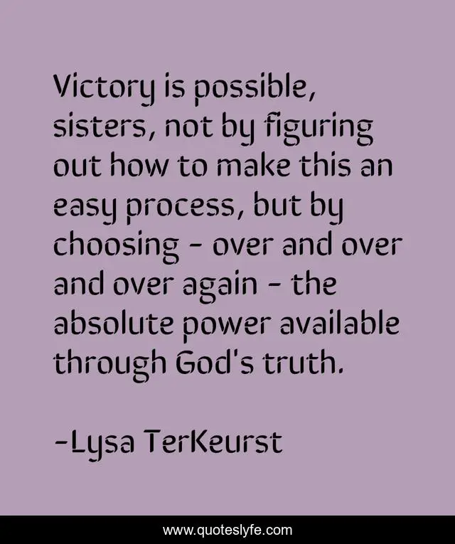 This page presents the quote "Victory is possible, sisters, not by figuring out how to make this an easy process, but by choosing - over and over and over again - the absolute power available through God's truth.". Author of this quote is Lysa TerKeurst. This quote is about victory, truth, choice,.