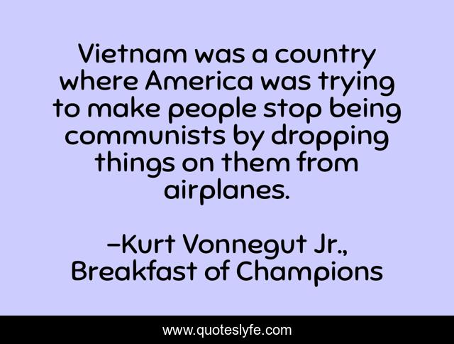 This page presents the quote "Vietnam was a country where America was trying to make people stop being communists by dropping things on them from airplanes.". Author of this quote is Kurt Vonnegut Jr., Breakfast of Champions. This quote is about communists, communism, airplanes, vietnam, bombs, america, vietnam-war,.
