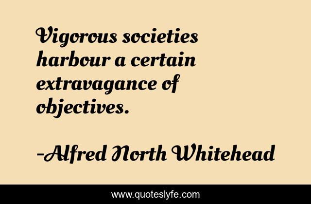 This page presents the quote "Vigorous societies harbour a certain extravagance of objectives.". Author of this quote is Alfred North Whitehead. This quote is about society, social,.
