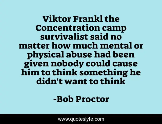 This page presents the quote "Viktor Frankl the Concentration camp survivalist said no matter how much mental or physical abuse had been given nobody could cause him to think something he didn't want to think". Author of this quote is Bob Proctor. This quote is about mind-power, mind, thoughts,.