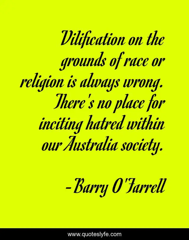 This page presents the quote "Vilification on the grounds of race or religion is always wrong. There's no place for inciting hatred within our Australia society.". Author of this quote is Barry O'Farrell. This quote is about society, hatred, place,.