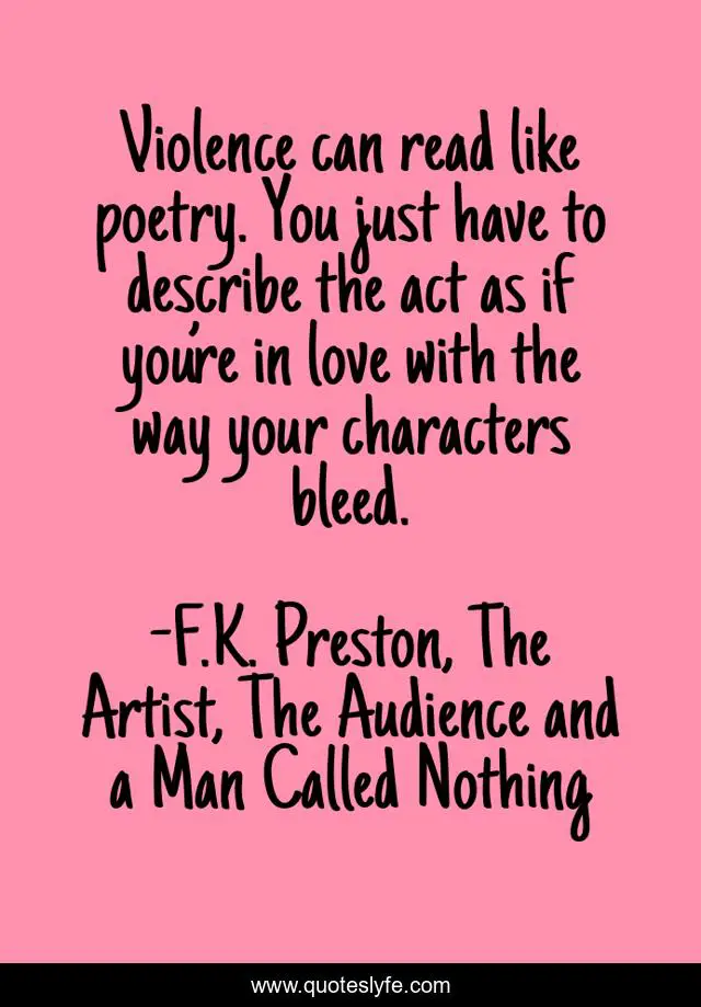 "F.K. Preston, The Artist, The Audience and a Man Called Nothing Quotes." Quoteslyfe.com, 2025. Mon. 08 Dec. 2025. <https://www.quoteslyfe.com/quote/Violence-can-read-like-poetry-You-just-29431>.
