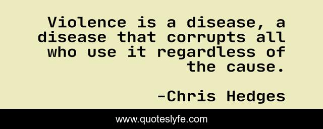 This page presents the quote "Violence is a disease, a disease that corrupts all who use it regardless of the cause.". Author of this quote is Chris Hedges. This quote is about violence, war,.