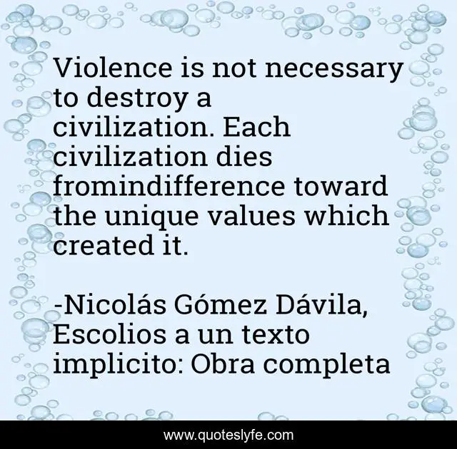 This page presents the quote "Violence is not necessary to destroy a civilization. Each civilization dies fromindifference toward the unique values which created it.". Author of this quote is Nicolás Gómez Dávila, Escolios a un texto implicito: Obra completa. .