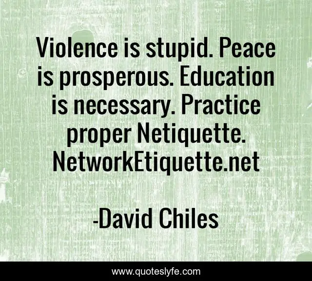 This page presents the quote "Violence is stupid. Peace is prosperous. Education is necessary. Practice proper Netiquette. NetworkEtiquette.net". Author of this quote is David Chiles. This quote is about peace, internet, netiquette, elearning, online, education,.