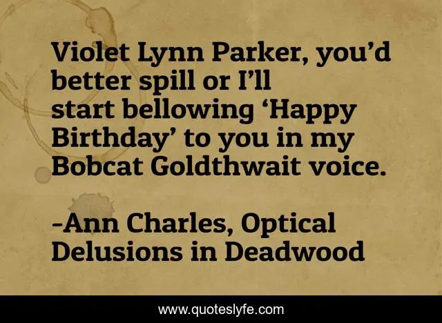 This page presents the quote "Violet Lynn Parker, you’d better spill or I’ll start bellowing ‘Happy Birthday’ to you in my Bobcat Goldthwait voice.". Author of this quote is Ann Charles, Optical Delusions in Deadwood. This quote is about mystery, humor, deadwood, romance-paranormal,.
