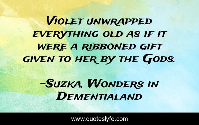 This page presents the quote "Violet unwrapped everything old as if it were a ribboned gift given to her by the Gods.". Author of this quote is Suzka, Wonders in Dementialand. This quote is about dementia, memory-loss, memory,.