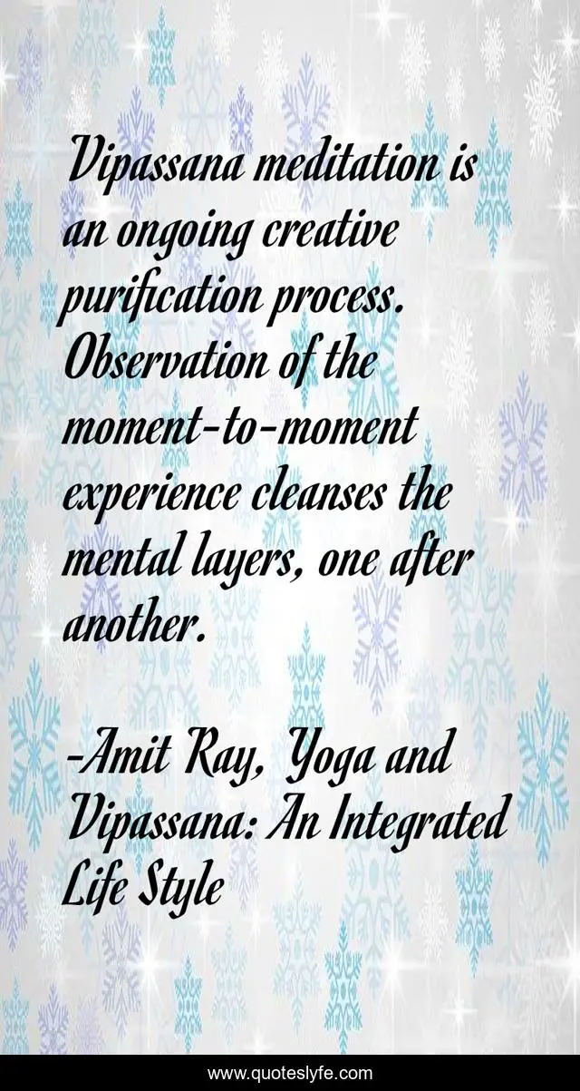 "Amit Ray, Yoga and Vipassana: An Integrated Life Style Quotes." Quoteslyfe.com, 2025. Tue. 09 Dec. 2025. <https://www.quoteslyfe.com/quote/Vipassana-meditation-is-an-ongoing-creative-purification-16202>.