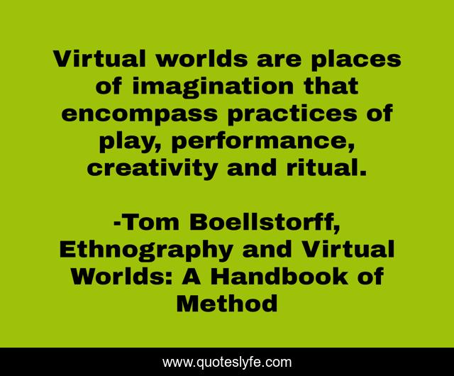 This page presents the quote "Virtual worlds are places of imagination that encompass practices of play, performance, creativity and ritual.". Author of this quote is Tom Boellstorff, Ethnography and Virtual Worlds: A Handbook of Method. This quote is about imagination, play, ritual, online,.