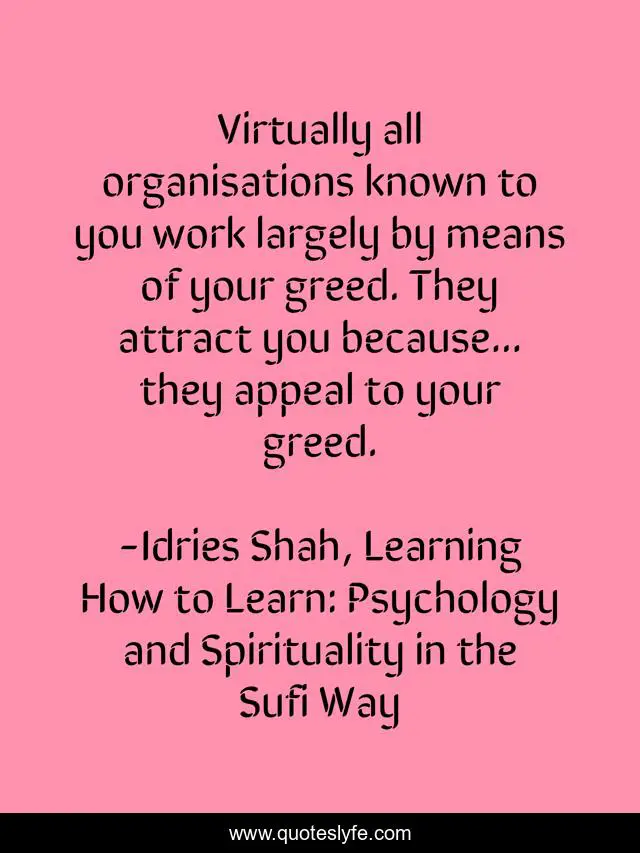 This page presents the quote "Virtually all organisations known to you work largely by means of your greed. They attract you because... they appeal to your greed.". Author of this quote is Idries Shah, Learning How to Learn: Psychology and Spirituality in the Sufi Way. This quote is about evolution, society, sufism, conditioning, manipulation, sufis, greed,.