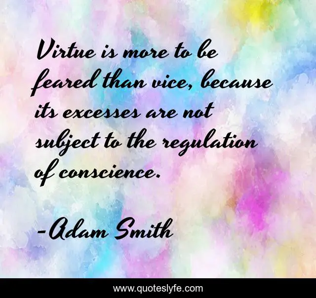 This page presents the quote "Virtue is more to be feared than vice, because its excesses are not subject to the regulation of conscience.". Author of this quote is Adam Smith. .