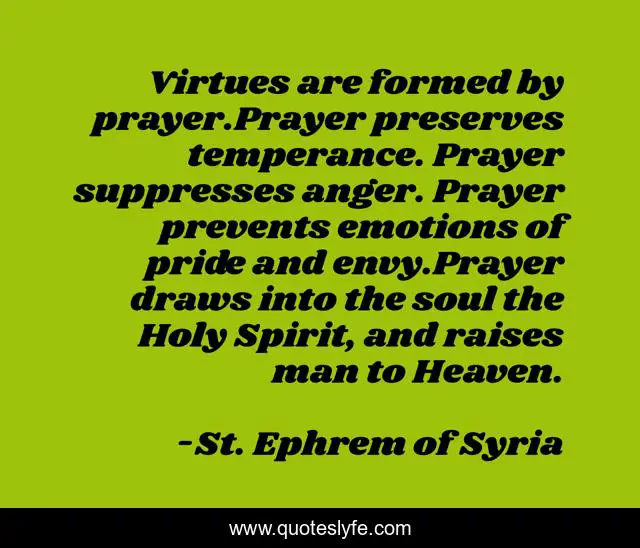 This page presents the quote "Virtues are formed by prayer.Prayer preserves temperance. Prayer suppresses anger. Prayer prevents emotions of pride and envy.Prayer draws into the soul the Holy Spirit, and raises man to Heaven.". Author of this quote is St. Ephrem of Syria. This quote is about envy, heaven, temperance, passions, soul, prayer, pride, holy-spirit,.