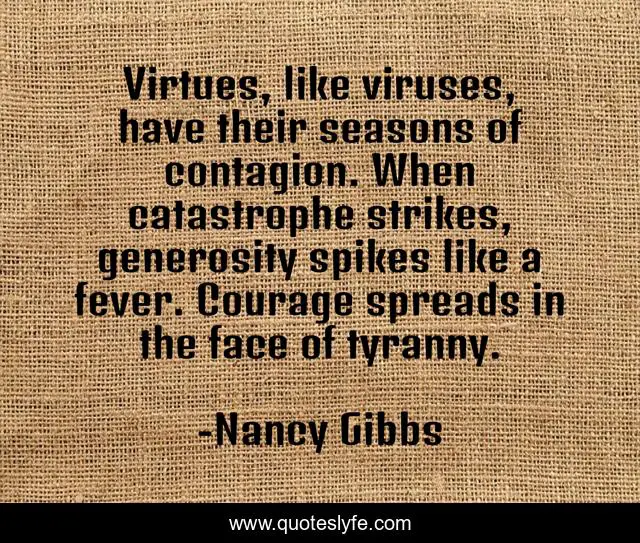 This page presents the quote "Virtues, like viruses, have their seasons of contagion. When catastrophe strikes, generosity spikes like a fever. Courage spreads in the face of tyranny.". Author of this quote is Nancy Gibbs. This quote is about tyranny, seasons, generosity,.