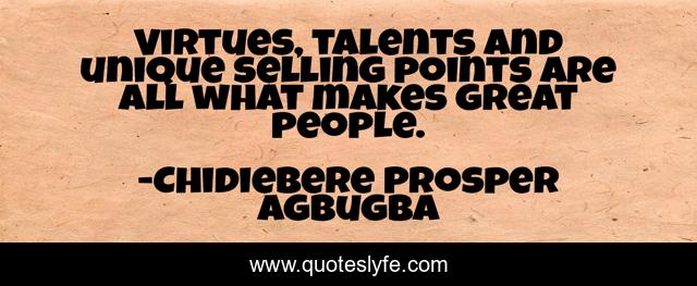 This page presents the quote "Virtues, talents and unique selling points are all what makes great people.". Author of this quote is Chidiebere Prosper Agbugba. This quote is about enthusiasm, talents, virtues, inspirational, greatness,.