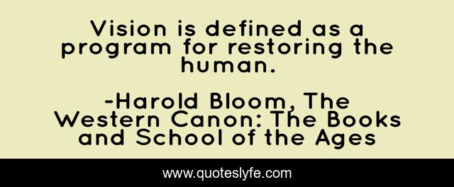 This page presents the quote "Vision is defined as a program for restoring the human.". Author of this quote is Harold Bloom, The Western Canon: The Books and School of the Ages. This quote is about revelation, identity, inspiration,.