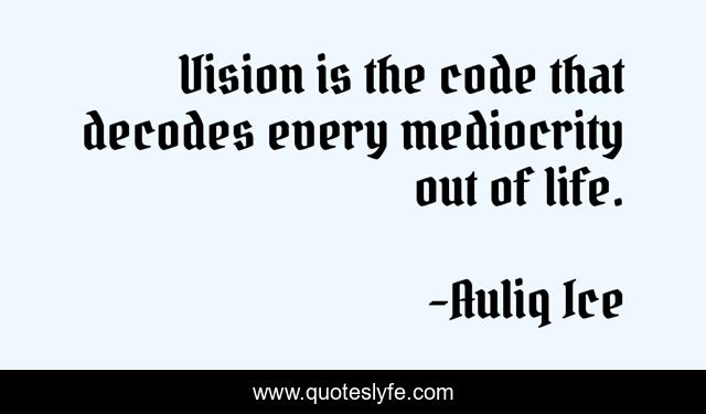 This page presents the quote "Vision is the code that decodes every mediocrity out of life.". Author of this quote is Auliq Ice. This quote is about success, chasing-dreams, positive-thinking, positive-attitude, dreams-come-true, courage, hope, visions-in-life, happiness,.