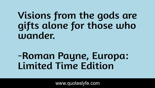 This page presents the quote "Visions from the gods are gifts alone for those who wander.". Author of this quote is Roman Payne, Europa: Limited Time Edition. This quote is about wanderlust, love-europa, wanderer, gods, visionaey, gifted, wanderess, visions, europa,.