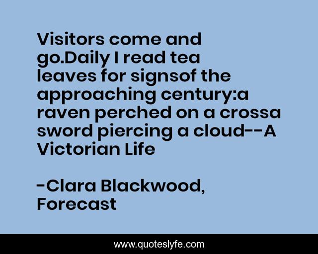 This page presents the quote "Visitors come and go.Daily I read tea leaves for signsof the approaching century:a raven perched on a crossa sword piercing a cloud--A Victorian Life". Author of this quote is Clara Blackwood, Forecast. .
