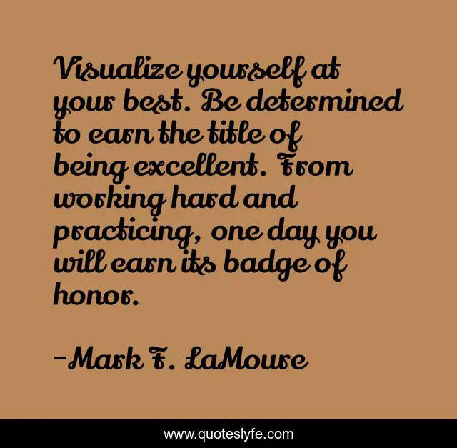 This page presents the quote "Visualize yourself at your best. Be determined to earn the title of being excellent. From working hard and practicing, one day you will earn its badge of honor.". Author of this quote is Mark F. LaMoure. This quote is about confidence, uplifting, success, positive, excellent-people, excellence, inspirational, self-help, enthusiasm,.