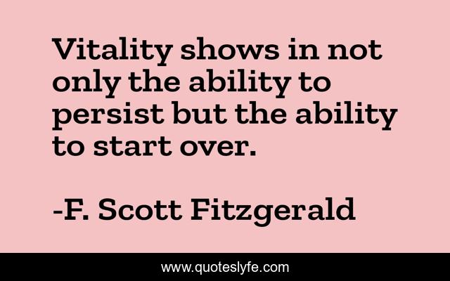 This page presents the quote "Vitality shows in not only the ability to persist but the ability to start over.". Author of this quote is F. Scott Fitzgerald. This quote is about start, ability, vitality,.