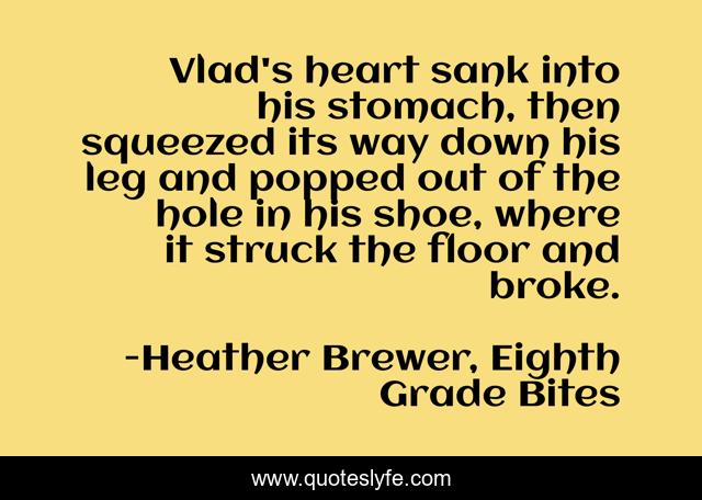 This page presents the quote "Vlad's heart sank into his stomach, then squeezed its way down his leg and popped out of the hole in his shoe, where it struck the floor and broke.". Author of this quote is Heather Brewer, Eighth Grade Bites. This quote is about heather-brewer, heartbreak, vladmir-tod, vampires,.