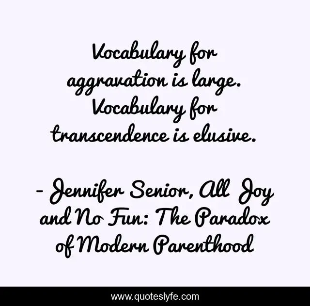 This page presents the quote "Vocabulary for aggravation is large. Vocabulary for transcendence is elusive.". Author of this quote is Jennifer Senior, All Joy and No Fun: The Paradox of Modern Parenthood. This quote is about word-choice, tone, worship, optimism, diction,.