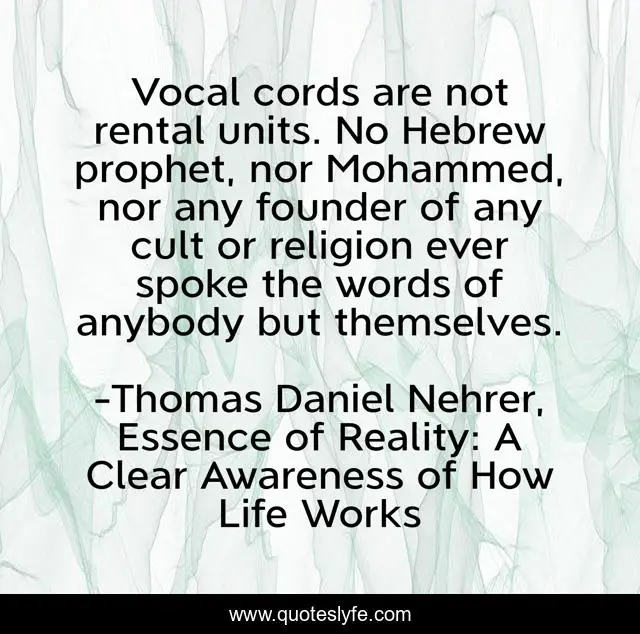 This page presents the quote "Vocal cords are not rental units. No Hebrew prophet, nor Mohammed, nor any founder of any cult or religion ever spoke the words of anybody but themselves.". Author of this quote is Thomas Daniel Nehrer, Essence of Reality: A Clear Awareness of How Life Works. This quote is about body-mind-spirit, philosophy, consciousness,.