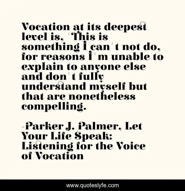 This page presents the quote "Vocation at its deepest level is, 'This is something I can't not do, for reasons I'm unable to explain to anyone else and don't fully understand myself but that are nonetheless compelling.". Author of this quote is Parker J. Palmer, Let Your Life Speak: Listening for the Voice of Vocation. This quote is about vocation, calling,.