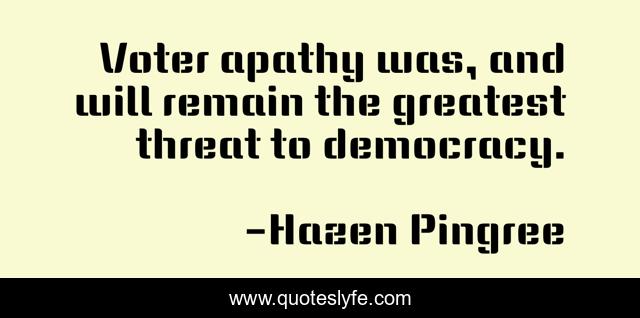 This page presents the quote "Voter apathy was, and will remain the greatest threat to democracy.". Author of this quote is Hazen Pingree. This quote is about apathy, voters, democracy, voting,.