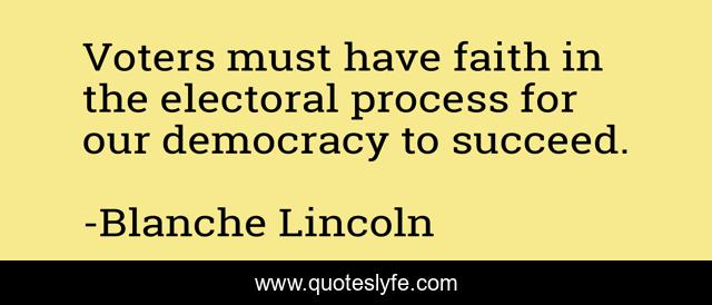 This page presents the quote "Voters must have faith in the electoral process for our democracy to succeed.". Author of this quote is Blanche Lincoln. This quote is about process, succeed, democracy,.
