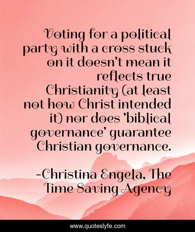 This page presents the quote "Voting for a political party with a cross stuck on it doesn't mean it reflects true Christianity (at least not how Christ intended it) nor does 'biblical governance' guarantee Christian governance.". Author of this quote is Christina Engela, The Time Saving Agency. This quote is about biblical-governance, true-christianity, christ, cross, reflects, political-party, voting, christian-governance,.